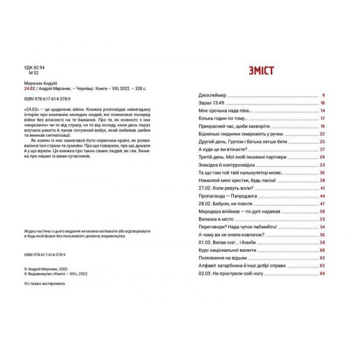 Видавництво "Книги - ХХІ" 24.02 Щоденник війни., Андрій Мероник 978-617-614-399-4 «24.02» – це щоденник війни. Книжка розповідає невигадану історію про компанію молодих людей, які опинилися посеред війни без власного на те бажання. Про те, як кожного з них «морозило» чи то від страху, чи то від холоду, коли десь поруч влучала ракета й лунав потужний вибух, який вибивав шибки та вмикав сигналізації.