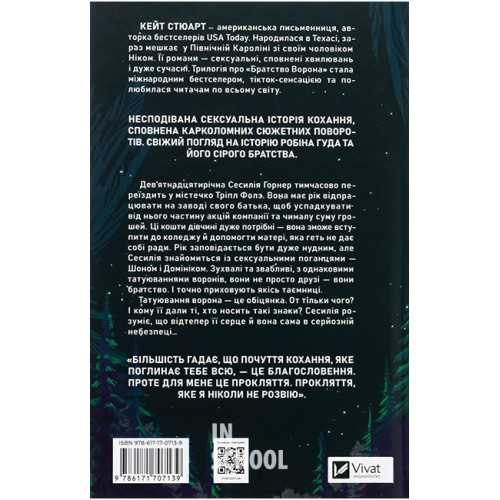 Братство Ворона. Книга 1. Ватага., Кейт Стюарт 978-617-17-0713-9 Дев’ятнадцятирічна Сесилія Горнер тимчасово переїздить у містечко Тріпл Фолз. Вона має рік відпрацювати на заводі свого батька, щоб успадкувати від нього частину акцій компанії та чималу суму грошей. Ці кошти дівчині дуже потрібні — вона зможе вступити до коледжу й допомогти матері, яка геть не дає собі ради. Рік заповідається бути дуже нудним, але Сесилія знайомиться із сексуальними поганцями — Шоном і Домініком. Зухвалі та звабливі, з однаковими татуюваннями воронів, вони не просто друзі — вони братство. І точно приховують якісь таємниці.Татуювання ворона — це обіцянка. От тільки чого? І кому її дали ті, хто носить такі знаки? Сесилія розуміє, що відтепер її серце й вона сама в серйозній небезпеці…