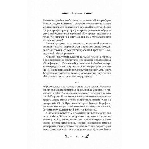 Доктор Серафікус., Домонтович В. 978-617-17-0488-6 Серце професора — це енциклопедія пристрастей, прихованих за списками літератури й примітками. У «Докторі Серафікусі» воно пульсує в унісон із вибуховими хвилями історії. Воно поривається до аудиторій і бібліотек, але не може уникнути парків і модних кав’ярень, затишних ярів і диких завулків. Чи важко натрапити на хіпстерку у 1920-х роках? Що простіше — закохатися в таку дівчину чи в місто? Як залишатися українськими інтелектуалами після навали «хороших росіян»?.. Відповіді знають В. Домонтович і його химерні, зате переконливі персонажі. Один із найзагадковіших українських романів уперше друкується з розділами й фрагментами, які дивом уціліли в архіві.