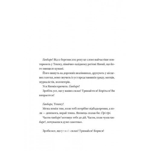 Видавництво "Книги - ХХІ" ҐАНБАРЕ! МАЙСТЕРКЛАС ІЗ ВМИРАННЯ., Катажина Боні 978-617-6146-72-8 Книжка польської репортерки Катажини Боні запрошує читача познайомитись із невідомою для європейців Японією. У репортажах, що ввійшли до видання, не йтиметься про теми, з якими ми асоціюємо цю країну: туризм, культуру, науку чи економіку. Натомість пізнаємо Японію, яка століття за століттям переживає природні катаклізми — землетруси й цунамі, що забирають людські життя і залишають по собі тисячі зниклих безвісти. Японію, яка в ХХ столітті зіткнулась із атомним вибухом, а відтак досвідчила катастрофи на АЕС, масштаб наслідків якої влада воліє замовчувати.