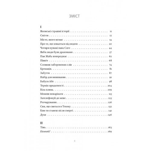 Як японці долають утрати і травми, як проживають катастрофи, що знищують цілі поселення або ж перетворюють їх у місця, непридатні для життя; як ставляться до смерті і про що воліють більше мовчати, ніж говорити, — саме цим темам присвячено книжку.