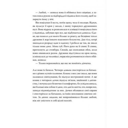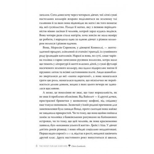 Рідна мова Так весело нам ще ніколи не було., Клер Ломбардо 978-617-8426-63-7 Мерилін і Девід познайомилися у 70-ті — і відтоді ніколи не розлучалися. Їхнім чотирьом дочкам, у кожної з яких далеко не простий характер, стосунки батьків здаються досконалими. Дівчата шукають себе, переживають злети й падіння, та якоїсь миті доходять висновку, що жодній із них не судилося пізнати таке щастя, яке мають батьки. Та чи це справді так?