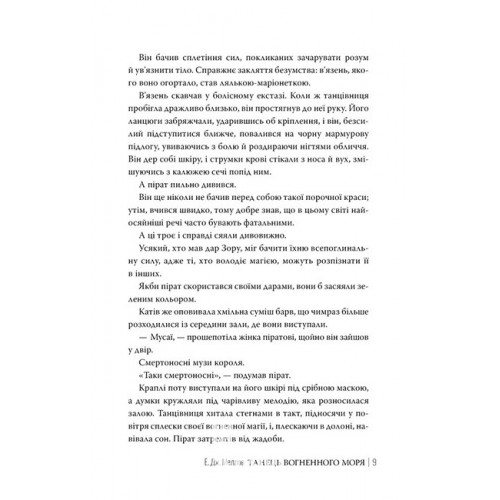 Рідна мова Танець вогненного моря. Цикл «Мусаї» Книга 2., Е. Дж. Меллов 978-617-8426-27-9 У світі Аадилору є потаємне місце, Королівство Злодіїв, де не бракує ані магії, ані втіх. Мусаї, три смертоносні чарівниці, зв’язані присягою та кров’ю, використовують свої сили, щоб зберегти скарби королівства.