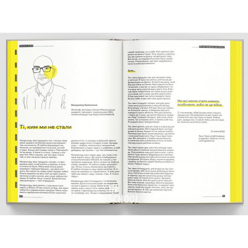 Ця книжка — своєрідний зліпок історії в момент її творення. Вона народилася з прагнення писати власну історію вже, шукати слова для опису спільного досвіду й розповідати світові про повномасштабну війну з Росією з погляду українців. У ній ідеться про фронт і тил, взаємну допомогу, міжнародну підтримку, переживання спільних трагедій і здобутків, культуру та гумор — про різні виміри життя країни та суспільства у час війни.