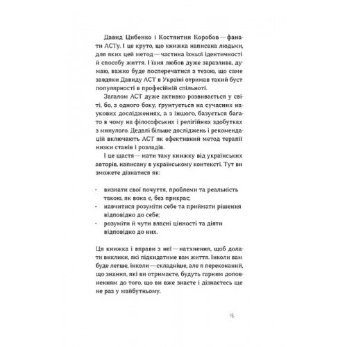 Розділ за розділом автори психотерапевт Давид Цибенко та журналіст Костянтин Коробов розказують, як інтегрувати у своє життя навички з терапії прийняття і зобов’язання, які допоможуть набути більшої психологічної гнучкості.