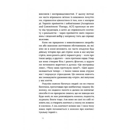 Підхід до психологічної гнучкості, описаний у цій книжці, допоміг надзвичайно різним людям долати виклики військового та цивільного життя, протистояти невиліковним хворобам і пережити горе втрати. Ви познайомитеся з їхніми історіями, а також із покроковим планом, який допоможе жити наповненішим життям попри все, що відбувається довкола нас щодня.