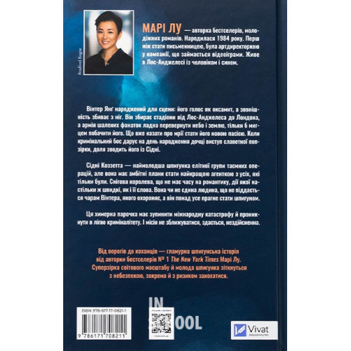 Зірки і дим., Марі Лу 978-617-17-0821-1 Вінтер Янґ народжений для сцени: його голос як оксамит, а зовнішність збиває з ніг. Він збирає стадіони від Лос-Анджелеса до Лондона, а армія шалених фанаток ладна перевернути небо і землю, тільки б мигцем побачити його. Що вже казати про мрії стати його новою пасією. Коли кримінальний бос дарує на день народження дочці виступ славетної попзірки, доля зводить його із Сідні.Сідні Коззетта — наймолодша шпигунка елітної групи таємних операцій, але вона має амбітні плани стати найкращою агенткою з усіх, які тільки були. Снігова королева, що не має часу на романтику, дії якої настільки ж швидкі, як і її слова. Вона чи не єдина людина, що не піддається чарам Вінтера, якого охороняє, а він понад усе прагне стати шпигуном.Ця химерна парочка має зупинити міжнародну катастрофу й проникнути в лігво криміналітету. І місія не зближуватися, здається, нездійсненна.
