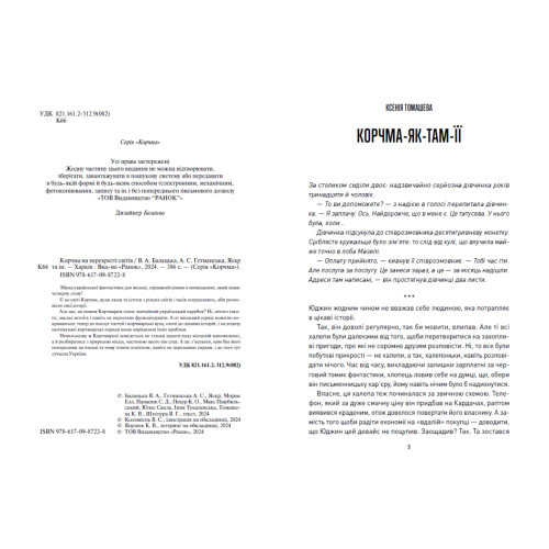 Корчма на перехресті світів., Ксенія Томашева 978-617-09-8722-8 Збірка української фантастики, справжній роман в оповіданнях, який ламає четверту стіну! Є на світі Корчма, куди люди та істоти з різних світів і часів потрапляють, аби розповісти свої історії. Але що, як новим Корчмарем стане звичайний український парубок? Ні, нічого такого, заклад встоїть і навіть не перестане функціонувати. А от місцевий сервіс помітно покращиться: тепер до послуг гостей і корчмарські вуха, охочі до цікавих історій, і на додачу неочікувані корчмарські поради щодо вирішення їхніх проблем.Новенькому ж Корчмареві доведеться не тільки давати раду місцевій кавомашині, а й розбиратися з природою місця, частиною якого він став. А ще з’ясувати, ким був його попередник на посаді та чому пішов поспіхом, навіть не передавши справи, і до чого тут сучасна Україна.Класичне, міське та українське фентезі, магічний реалізм, постапок, кіберпанк, м’яка наукова фантастика від одинадцяти українських авторок та авторів сплетуться разом, щоб розповісти про людей (та інших істот), які наважилися діяти й змінювати світ.