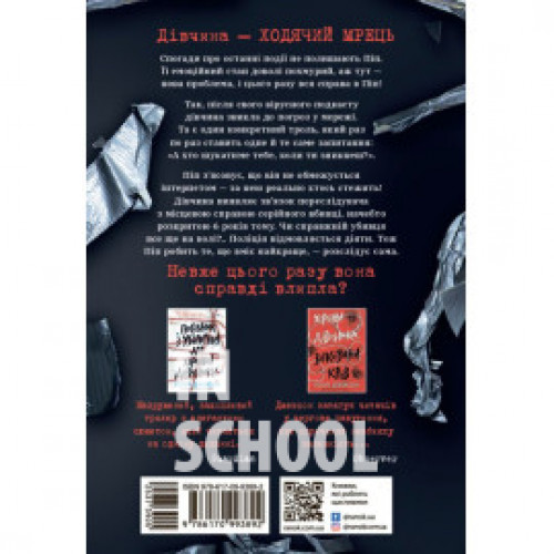 Ні жива ні мертва., Голлі Джексон 978-617-09-9389-2 Спогади про останні події не полишають Піп. Її емоційний стан доволі похмурий, аж тут — нова проблема, і цього разу вся справа в Піп! Так, після свого вірусного подкасту дівчина звикла до погроз у мережі. Та є один конкретний троль, який раз по раз ставить одне й те саме запитання: «А хто шукатиме тебе, коли ти зникнеш?».Піп з’ясовує, що він не обмежується інтернетом — за нею реально хтось стежить! Дівчина виявляє зв’язок переслідувача з місцевою справою серійного вбивці, начебто розкритою 6 років тому. Чи справжній убивця все ще на волі?.. Поліція відмовляється діяти. Тож Піп робить те, що вміє найкраще — розслідує сама. Невже цього разу вона справді влипла?