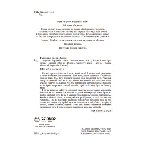 Вартові Кордонів і Меж. Посвята меча., Гаэль Алехо Грахилья 978-617-09-9351-9 Віддавна в прекрасній Террані людство співіснує з містичним і таємничим, та геть не дружнім. Хитрі фейрі, підступні демони, чорні чаклуни й прибічники темних культів прагнуть знищити людей, розставляючи смертельні пастки, а як ні — бодай утнути якусь капость. Древні спілки відважних чоловіків і жінок, Корпус Паладинів та Колегія Святої Інквізиції, боронятьспокій людства, захищаючи світ від темряви. А на сміливців, які наважилисявступити в ці спілки й присвятити себе боротьбі зі зловісним і лихим, чекає суворе навчання й посвята.Повага їм ічесть… …проте студенти є студенти. Так, вони гідно приймають виклики,але якщо є манюнький шанс уляпатися в історію, — не зволікатимуть. Провести ніч у склепі й зняти закляття з мертвої нареченої; убити бестію в підвалі, допомогти вдові славетного воїна позбутися таємничого обманщика-ґвалтівника? Залюбки! Улаштувати сварку зі студентами-магами й рознести веселий притон — і це до них!Або витягати з халепи спадкоємця титулу й спричинити купу політичних проблем. Пригоди чигають на юних паладинів завжди йусюди. Але чого жалітися? Адже старовинне правило Паладинського Корпусу: «справжній досвід отримуєш в бою».Шалені пригоди й битви зі злом, нудні лекції й виснажливі тренування з мечем і бойовим заклинанням…. Таке воно, життя студентів — майбутніх лицарів Діви. Про його перипетії повідав нам таємничий метр Грахілья, автор знаменитої серії книг про відважних юнаків, які забажали стати учнями Корпусу Паладинів. Але для завершення навчання самого бажання мало. Треба витримати суворий вишкіл і пройти Посвяту Духа та Посвяту Меча. І от не встигли майбутні оборонці людства відсвяткувати церемонію Посвяти, як їх з вогню та в полум'я — давай, підтверджуй ділом право на щойно здобутий меч. Та ще й завданнячка мудрі наставники підбирають… Бестію в підвалі убити, з полтерґейстом розібратися, а то й у склепі початувати…