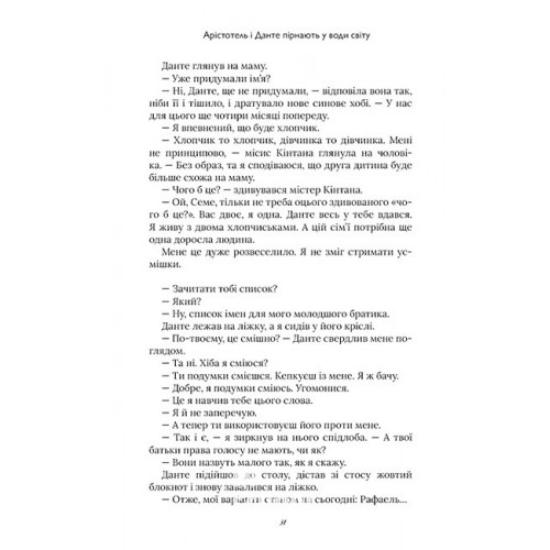 Видавництво "ARTBOOKS" Арістотель і Данте пірнають у води світу(Limited Edition)., Бенджамін Аліре Саенс 978-617-523-289-7 Продовження світового бестселера «Арістотель і Данте відкривають таємниці Всесвіту» від Бенджаміна Аліре Саенса — це ніжна, глибока й емоційна історія про пошук себе. Арі й Данте дорослішають, відкриваючи для себе світ із його красою й жорстокістю, любов’ю й втратами. Це книга про силу дружби, перше кохання та прийняття себе у світі, що іноді буває несправедливим.