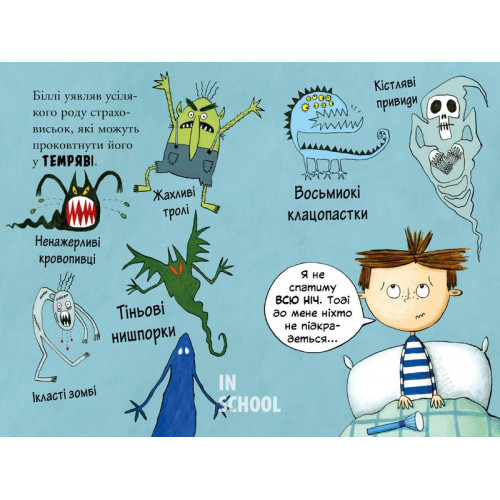 Видавництво "ARTBOOKS" Біллі та малі монстри. Монстри у темряві., Занна Девідсон 978-617-5230-03-9 Біллі вирішує: треба не спати вночі, і тоді моторошні монстри до нього не прийдуть. Аж раптом він чує який тихий писклявий голос, а тоді помічає дивні фіолетові сліди. А ще хтось напав на його бутерброд! І в шафі пахнуть зовсім не його шкарпетки…Смішна історія для найменших читачів, що допоможе боротися із дитячими страхами. Бо всім відомо: найкраща зброя проти страху – це сміх!