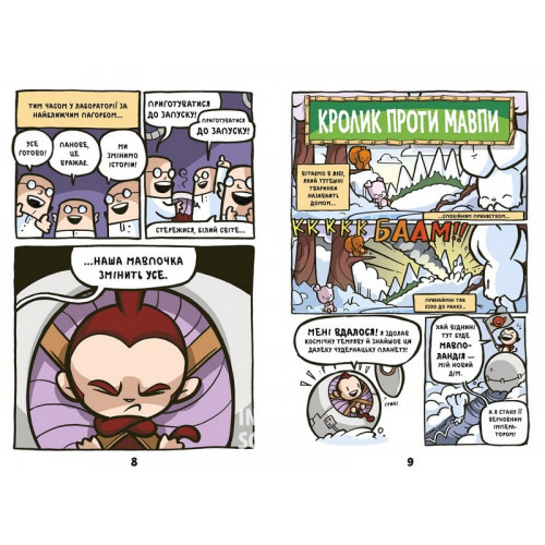 Видавництво "ARTBOOKS" Кролик проти Мавпи., Джеймі Смарт 978-617-523-362-7 Тримайтеся, найсмішніша битва у світі розпочалася!Мирному життю Кролика, білченяти Вінні, поросятка Свина, Ле Лиса, Бобра-Мотора й Скунса приходить кінець, коли ракета Мавпи аварійно приземляється в лісі! Мавпа переконаний, що відкрив новий світ. Він, одержимий владою і винаходами, затявся верховодити над усіма лісовими мешканцями. Та Кролик має намір покласти край вибрикам чужинця. Але чи вдасться це йому?Це перша частина серії кумедних та часом абсурдних пригод, які змусять хапатися за живота.Комікс легко читати, що ідеально підійде для діток молодшого шкільного віку.Чудові й смішні ілюстрації закохають дитину в цю книжку.Наприкінці коміксу є інструкція, яка допоможе власноруч намалювати головних героїв.На Британській книжковій премії-2024 Джеймі Смарт став «Ілюстратором року», а одна із частин «Кролика проти Мавпи» перемогла в номінації «Дитяча ілюстрована книга року».