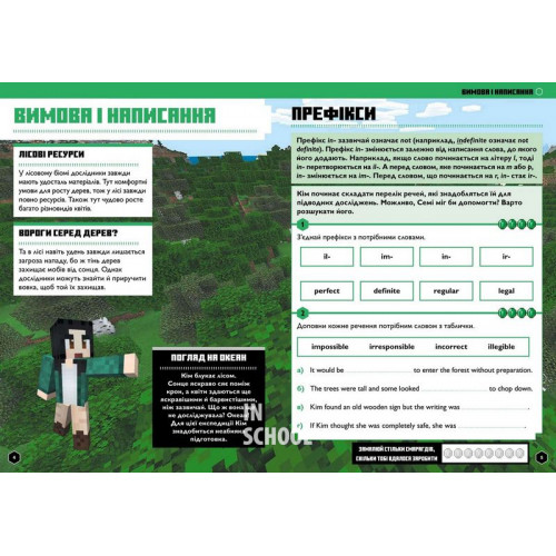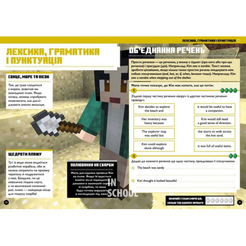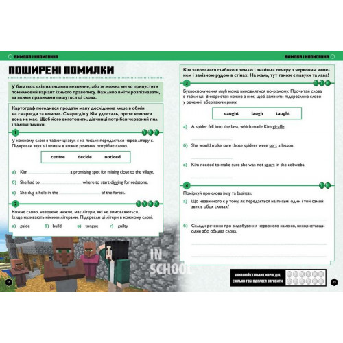 Видавництво "ARTBOOKS" MINECRAFT Англійська мова. Офіційний посібник. 11-12 років., Джон Гоулдінг, Ден Вайтгед 978-966-1545-72-3 Вітаємо на порозі захопливих освітніх вражень! Ваша дитина вирушить у кілька пригод дивовижним світом Minecraft, вдосконалюючи знання англійської мови в процесі. Вирушайте у пригоду світом Minecraft завдяки посібнику! Ігрові персонажі, Том і Єва, які зустрінуться читачеві на сторінках посібника, виконують непрості місії і відважно шукають скарби... повсякчас відбиваючись від надокучливих мобів!Чому варто придбати:• У кожній пригоді ваша дитина виконає базові завдання з обраної теми й отримає в нагороду певну кількість смарагдів. Згодом їх можна буде «обміняти» на останній сторінці.• Найскладніші завдання, спрямовані на розширення процесу навчання, а відповіді додано наприкінці посібника.• Під час роботи з цим посібником, вашій дитині може знадобитися допомога. Наприклад, ви можете прочитати їй пояснення, або ж за потреби разом виконати завдання.• Почніть нову пригоду Minecraft. Застосуйте знання та вміння, отримані протягом навчання, щоб виконати завдання й здобути нагороди.• Виконуйте вправи, щоб допомогти персонажам Minecraft завершити свої місії!• У кожній темі досліджуйте різні біоми.• Збирайте смарагди, аби здобути винагороду наприкінці посібника.• Не зупиняйтеся на простому й переходьте до складніших завдань!