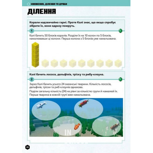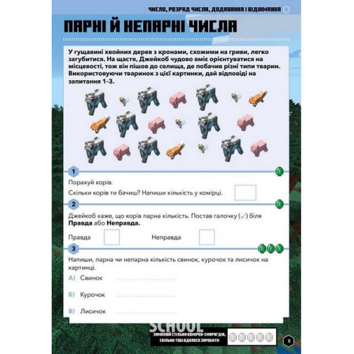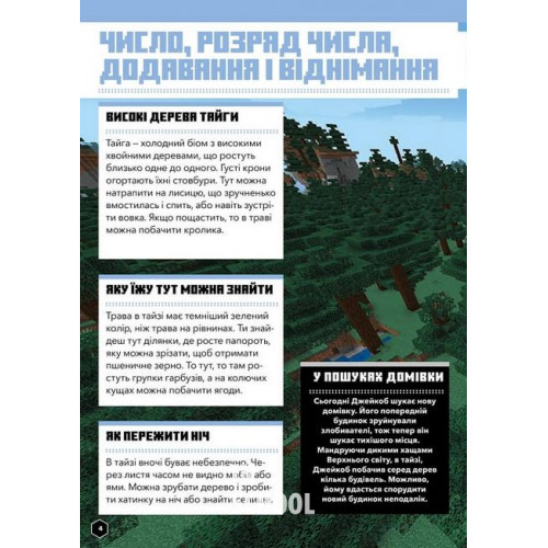 Видавництво "ARTBOOKS" MINECRAFT Математика. Офіційний посібник. 6-7 років., Ден Ліпскомб, Бред Томпсон 978-617-5230-17-6 Вітаємо на порозі захопливих освітніх вражень! На сторінках цього посібника ваша дитина порине у світ Minecraft з його калейдоскопом пригод і вражень, водночас відточуючи свої математичні навички. З його допомогою ваша дитина перенесеться у захопливий світ, де на неї чекатимуть ігрові персонажі — Джейкоб і Калі, а також будівництво споруд і пошуки скарбів… А ще ж треба давати раду докучливим мобам!