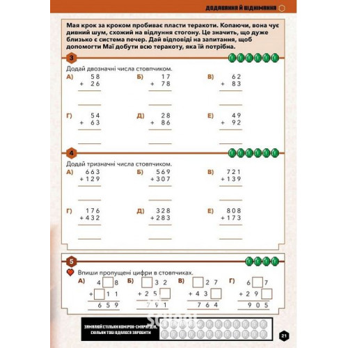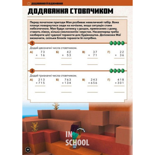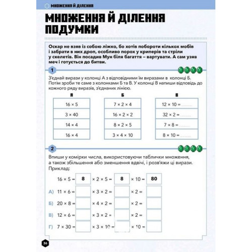 Видавництво "ARTBOOKS" MINECRAFT Математика. Офіційний посібник. 7-8 років., Ден Ліпскомб, Бред Томпсон 978-617-5230-20-6 Вітаємо на порозі захопливих освітніх вражень!На сторінках цього посібника ваша дитина порине у світ Minecraft з його калейдоскопом пригод і вражень, водночас відточуючи свої математичні навички. З його допомогою ваша дитина перенесеться у захопливий світ, де на неї чекатимуть ігрові персонажі — Джейкоб і Калі, а також будівництво споруд і пошуки скарбів… А ще ж треба давати раду докучливим мобам!Дитина в ігровій формі розв’язуватиме тематичні задачі та за кожну відповідь зароблятиме певну кількість смарагдів. Згодом їх можна буде «обміняти» на останній сторінці.• Задачі підвищеної складності позначені символом та покликані заохотити дитину до навчання, а відповіді додано наприкінці посібника.• Під час роботи з цим посібником, вашій дитині може знадобитися допомога. Наприклад, ви можете прочитати їй пояснення, або ж за потреби разом виконати завдання.• Почніть нову пригоду Minecraft. Застосуйте знання та вміння, отримані протягом навчання, щоб виконати задачі й здобути нагороди.