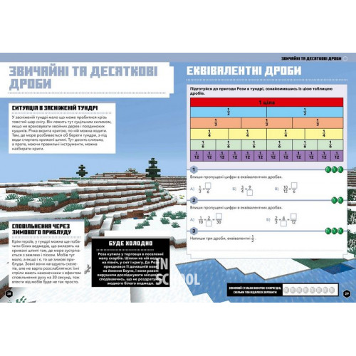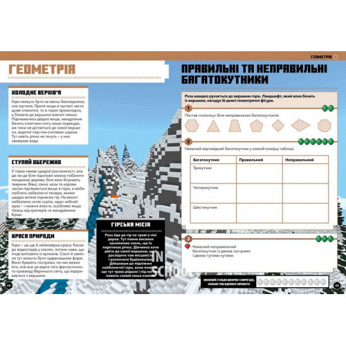 Видавництво "ARTBOOKS" MINECRAFT Математика. Офіційний посібник. 9-10 років., Ден Ліпскомб, Бред Томпсон 978-617-5230-05-3 Вітаємо на порозі захопливих освітніх вражень! На сторінках цього посібника ваша дитина порине у світ Minecraft з його калейдоскопом пригод і вражень, водночас відточуючи свої математичні навички. З його допомогою ваша дитина перенесеться у захопливий світ, де на неї чекатимуть ігрові персонажі — Джейкоб і Калі, а також будівництво споруд і пошуки скарбів… А ще ж треба давати раду докучливим мобам!Чому варто придбати:• Дитина в ігровій формі розв’язуватиме тематичні задачі та за кожну відповідь зароблятиме певну кількість смарагдів. Згодом їх можна буде «обміняти» на останній сторінці.• Задачі підвищеної складності позначені символом та покликані заохотити дитину до навчання, а відповіді додано наприкінці посібника.• Під час роботи з цим посібником, вашій дитині може знадобитися допомога. Наприклад, ви можете прочитати їй пояснення, або ж за потреби разом виконати завдання.• Почніть нову пригоду Minecraft. Застосуйте знання та вміння, отримані протягом навчання, щоб виконати задачі й здобути нагороди.• Виконуйте вправи, щоб допомогти персонажам Minecraft завершити свої місії!• У кожній темі досліджуйте різні біоми.• Збирайте смарагди, аби здобути винагороду наприкінці посібника.• Не зупиняйтеся на простому й переходьте до складніших завдань!
