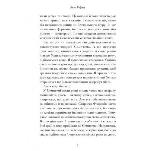 Видавництво "ARTBOOKS" Семптем., Анна Софіна 978-617-523-149-4 Майбутнє — це коли починають здійснюватися найоптимістичніші прогнози песимістів.Семптем — футуристичне семирівневе місто, що захищає мешканців від небезпечного зовнішнього світу. Кожен рівень має своє призначення та особливості: що вищий рівень, то краща якість життя. Перейти з нижчого рівня на вищий майже неможливо, але Ірисі це вдалося, адже її призначили доглядальницею немовляти в сім’ї винахідників з другого рівня. Та не встигла дівчина звикнути до нового життя, як почалися жахливі події: містом шириться загадкова смертоносна хвороба, а загарбники скористалися нагодою і намагаються захопити Семптем. Ірисі доводиться рятувати не лише немовля, а й ціле місто. А ще стрімко дорослішати, знаходити союзників, ухвалювати складні рішення та слідувати цінностям у світі, де подеколи важко збагнути, хто свій, а хто чужий.