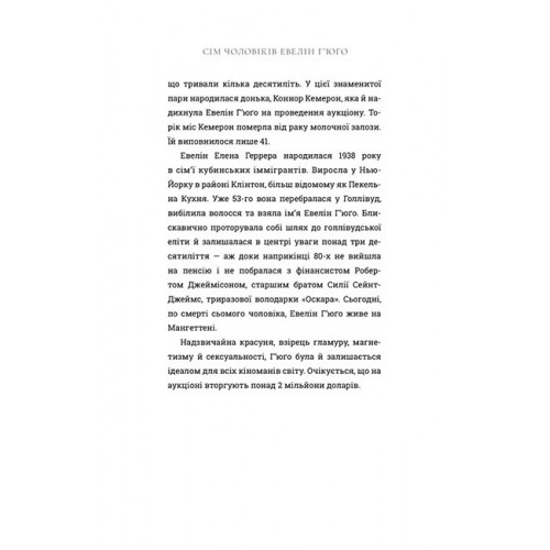 Видавництво "ARTBOOKS" Сім чоловіків Евелін Г’юґо pocketbook., Тейлор Дженкінс Рід 978-617-523-197-5 Завзятий підйом до вершини, ризики, втрачене кохання та давні таємниці, які публіка не могла собі навіть уявити..Евелін Г’юґо, у минулому голлівудська ікона кіно, нарешті готова пролити світло на своє гламурне і скандальне життя. Але коли задля цієї мети вона обирає нікому невідому репортерку з журналу Монік Грант, це дивує всіх, а найбільше — саму Монік. Чому вона? Чому зараз?Сповнена рішучості використати цю можливість, Монік вислуховує історію життя кінодіви. Від її шляху до Лос-Анджелеса у 1950-х до рішення залишити шоу-бізнес у 80-х і, звичайно, про сім чоловіків у житті Евелін.Акторка розкриває правду про нещадні амбіції, несподівану дружбу та велике заборонене кохання. Монік починає відчувати справжній зв’язок із легендарною зіркою, та коли історія наближається до завершення, стає зрозуміло, що життя Евелін перетинається з її власним, трагічно й невідворотно.