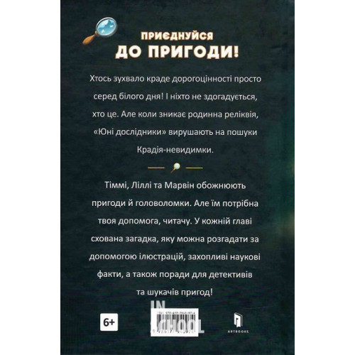 Видавництво "ARTBOOKS" Тіммі Тоббсон. Загублене намисто., Єнс Ваґнер 978-617-7940-97-4 Друга книжка у новій серії про Тіммі Тоббсона для юних дослідників!Хтось зухвало краде дорогоцінності просто серед білого дня! І немає жодних здогадів, хто це. Але коли зникає родинна реліквія, «Юні дослідники» вирушають на пошуки Крадія-невидимки.• Це пригодницька історія з яскравими ілюстраціями, що мають не лише декоративну функцію — на них заховані підказки до загадок, які читач розгадуватиме разом із головними героями.• У кінці книжки міститься добірка цікавих енциклопедичних фактів, а також практичні завдання!