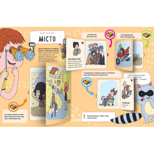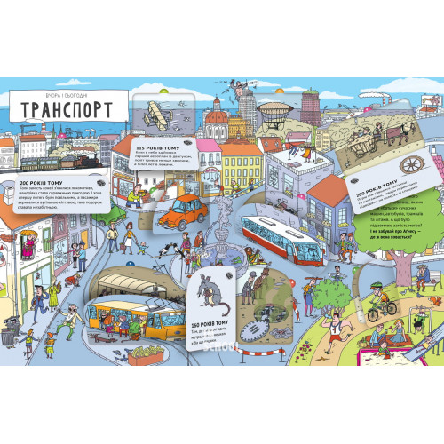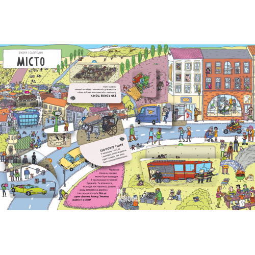 Видавництво "ARTBOOKS" ВЧОРА ТА СЬОГОДНІ. Місто., Ева Обуркова 978-617-7395-96-5 Розкрій книгу і зазирни у минуле!Дітям буває важко по-справжньому уявити світ навколо без машин, метро і комп'ютерів. Не дивно, коли ти народився в еру смартфонів і інтерактивних дошок... А якщо згадати, що колись не було навіть торгових центрів, ранців, системи каналізації та міських автобусів!? Беремо в руки чарівний бінокль і вирушаємо у захоплюючу подорож крізь час!Для чого ми видали «Вчора і сьогодні. Місто»: Цілих 60 віконець дадуть дитині можливість порівнювати різні предмети і механізми, які є сьогодні, з їх попередниками 100, 300, 20 000 років тому!Читачі відправляться в захоплюючу подорож і дізнаються багато історичних фактів про те, як жилося їх предкам у місті, прадідам і прабабусям навчалося в школі, як прапрадід і прапрабабуся розважалися взимку і багато іншого.Ця яскрава і дуже цікава книга сподобається як школярам, так і допитливим дошкільнятам, які прагнуть дізнатися про все на світі.На кожному розвороті дитину чекає весела гра. Десь сховалася пустотлива енотиха, а шукати її — одне задоволення.