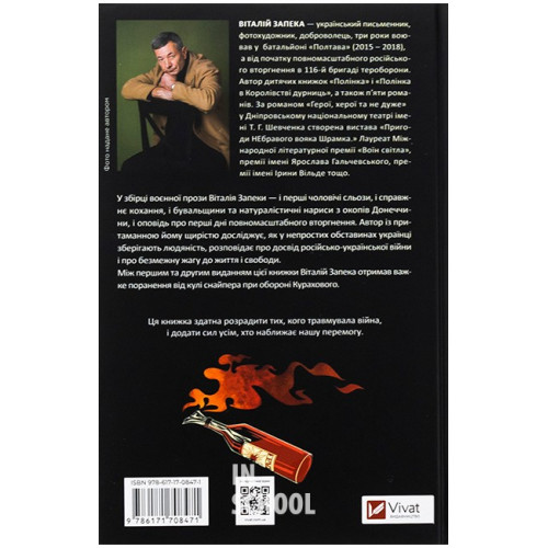 Бабах на всю голову., Запека В. 978-617-17-0847-1 Книга «Бабах на всю голову» — це збірка пронизливих текстів про російсько-українську війну від письменника Віталія Запеки. З чесної та щирої розповіді автора перед читачами постає буденність війни, у сутінках якої прихована нездоланна віра й надія навіть у найгірші часи. Талановито й з великою уважністю до людської природи автор занурює в тексти, що навдивовижу майстерно поєднують моторошні сцени, моменти сентиментальності й несуть світло сподівань.У цих історіях переплітаються смерть і повернення, любов і ненависть, щастя й глибокий розпач, людяність і жорстокість, а на сторінках з?являються правдиві герої: від військовослужбовців, що боронять Україну — і до тих, хто в цю боротьбу не вірить. Воєнна проза Запеки — сувора, чесна й навіть життєдайна.