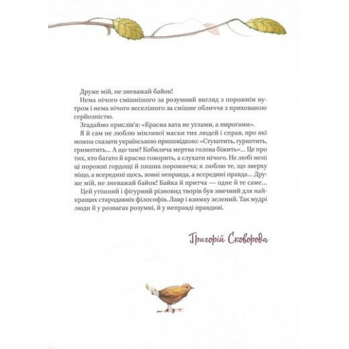 Байки., Григорій Сковорода 978-966-982-135-5 Байки Григорія Сковороди — це філософські мініатюри, розмисли про сродну працю, щастя та вдячність, яка має наповнювати кожну мить життя мудрої людини. Але насамперед це добрі й кумедні оповідки про тварин, які хитрують, ледарюють, бояться і деруть носа, як справжнісінькі люди. Герої байок покажуть, як важливо бачити не тільки зовнішню, а й внутрішню суть речей, братися за ту справу, до якої маєш здібності, не обманювати інших і цінувати час.
