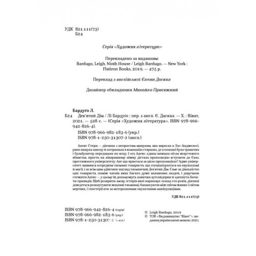 Дев'ятий Дім., Лі Бардуґо 978-966-982-183-6 Алекс Стерн — медіум, яка має здатність контактувати з привидами, і сама страждає через це. Це призводить її до наркотичної залежності, потім, як наслідок — до важкої психологічної травми, потім до того, що їй доводиться ділити тіло з привидом, а згодом і за ґрати. Але раптом Алекс отримує шанс почати нове життя та навчання у Єльському університеті. Але не все так просто! По-перше, коли вона прибуває на нове місце, там одразу ж стається вбивство. Алекс дають зрозуміти, що вона у небезпеці також. А по-друге, з неї не зводить уваги один з найтаємничіших та найжорстокіших таємних окультних орденів. Тепер увесь цей клубок їй доведеться розплутувати. А читачам — пристебнути ремені свідомості міцніше, адже вони вирушають у моторошний, темний, загадковий світ, просякнутий жорстокістю, інтригами та магією смерті.
