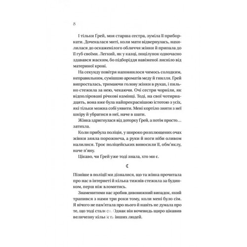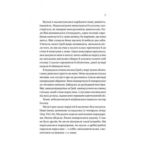 Дім Голлоу., Сазерленд К. 978-617-17-0711-5 Сестри Голлоу — неймовірно вродливі, гламурні та лякаюче дивні. Навколо Ґрей, Віві та Айріс відбуваються темні й незрозумілі речі. Все почалося кілька років тому, коли дівчата зникли з вулиці Единбурга, а за місяць раптово повернулися. Сестри не можуть пригадати, що саме сталося, але це лишило у кожної з них однаковий слід у формі півмісяця під горлом. Вони разюче змінилися після того випадку — колись темнокосі блакитноокі сестрички тепер мали волосся молочного кольору та моторошні чорні очі. Дівчата мають неймовірний апетит, але не набирають вагу. Їхня холодна краса вражає і відлякує водночас. Де вони були? Що з ними сталося?Коли за підозрілих обставин зникає старша сестра, Ґрей, життя 17-річної Айріс стає ще дивнішим: моторошні знахідки, жахливі уривчасті спогади, а ще за нею стежить чоловік з рогами. Вона вирушає слідами зниклої сестри й усвідомлює: єдиний спосіб врятувати Ґрей — розгадати таємницю того, що відбулося з ними в дитинстві. Що ближче дівчина наближається до істини, то більше вона розуміє, що в дитинстві з ними сталося щось насправді жахливе, і старша сестра це приховувала.Книга «Дім Голлоу» — це містичний трилер австралійської авторки Крістал Сазерленд. Краса Ґрей, Віві та Айріс була винятковою, вони мали розкішне темне волосся й блакитні, мов джерельна вода, очі. Та кілька років тому дівчата змінилися: сестри Голлоу раптово зникли, а повернулися зі шрамами-півмісяцями, світлим волоссям і химерними чорними очима. Ніхто, навіть дівчата не знають, що тоді трапилося.Айріс має розгадати цю таємницю: зникла старша сестра Ґрей, а єдиний спосіб врятувати її — дізнатися моторошну правду.