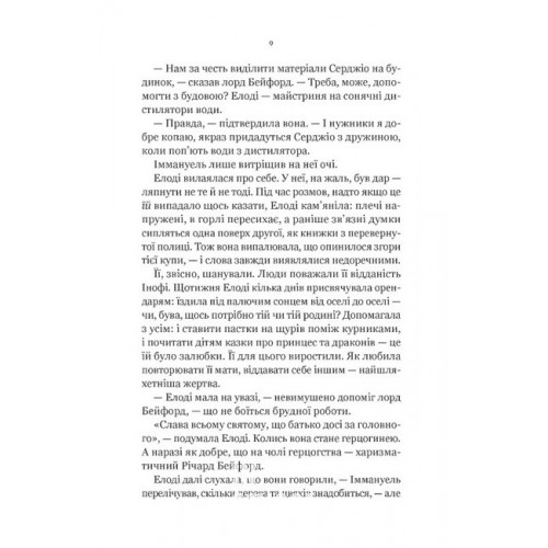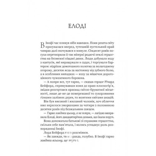Діва проти біди., Евелін Скай 978-617-17-0543-2 Елоді, донька лорда Бейфорда, ніколи не прагнула залишити рідне герцогство Інофі, радше навпаки — була переконана, що її призначенням є всіляко допомагати своєму народові. Життя в їхньому краї непросте: клімат непередбачуваний, врожаї мізерні, а люди часто-густо потерпають від голоду. Тож коли батько повідомив доньку, що свататиме її за Генрі, принца з успішного та квітучого острова Аврея, в обмін на повні сховища цієї зими й кожну зиму опісля, вона погодилася. До того ж Елоді листувалася з Генрі та знає його як приємну й цікаву людину. А проте, щось не сходилося. Інофі отримає підтримку та провізію. Що натомість матиме Аврея? На жаль, Елоді про все дізнається, коли вже буде принцесою в земному раю, який цілком може стати смертельною пасткою. Тим паче, вона не перша дівиця, котра погодилася на таку на позір вигідну угоду з дивним гаслом: «Життя за життя. Кров за вогонь».