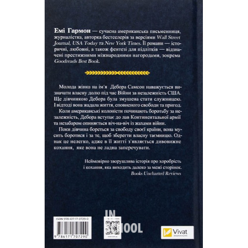 Дівчина на ім'я Самсон., мЕмі Гармон 978-617-17-0729-0 Молода жінка на ім’я Дебора Самсон наважується визначати власну долю під час Війни за незалежність США. Ще дівчинкою Дебора була змушена стати служницею. І відтоді вона жадала життя, сповненого свободи та пригод. Коли американські колоністи починають боротьбу за незалежність, Дебора вступає до лав Континентальної армії та незабаром опиняється віч-на-віч із жахами війни. Поки дівчина бореться за свободу своєї країни, вона мусить боротися і за те, щоб зберегти власну таємницю. Однак це нелегко, адже в її житті з’являється дивовижне кохання, яке вона не ладна заперечувати.