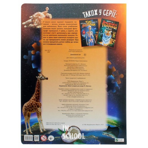 Дивовижний світ., Марія Жученко 978-966-982-261-1 У ваших руках чудовий подарунок малюкові — велика яскрава енциклопедія для найменших. Вона стане улюбленою книжкою вашої дитини, кольорові фотографії привернуть її увагу, а короткі, але змістовні статті допоможуть вам відповісти на запитання маленького чомучки. Разом із вамималя навчиться складати пазли, що прикрашають кожен розворот. Така книжка прищепить дитині любов до читання й пізнавання нового.