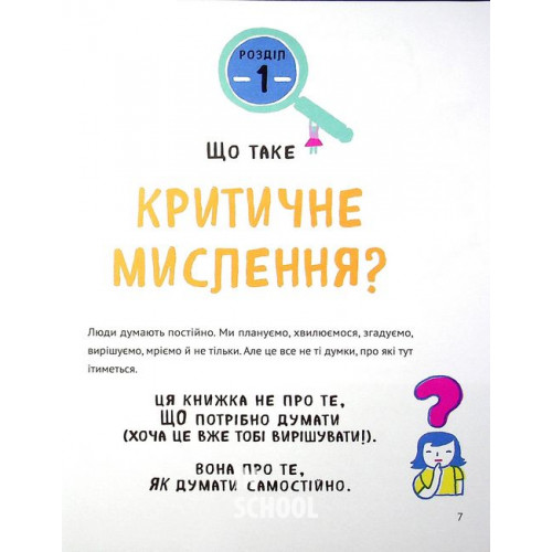 Думай сам: розвиваємо критичне мислення., Андреа Деббінк 978-966-982-375-5 Зупинися на мить і дай собі відповідь: чиї думки нині у твоїй голові? Щодня тебе атакує величезний обсяг інформації: дописи блогерів у соцмережах, повідомлення в новинах, випадкові чутки. І все це справляє неабиякий вплив на поведінку, настрій і навіть ставлення до світу.Ця книжка допомагає у виробленні й тренуванні навичок критичного мислення. Вона спонукає запитувати, пізнавати, досліджувати, а не просто брати будь-що на віру. Для досягнення мети потрібно тільки трохи повправлятися з новими «обладунками». А тренування: корисну інформацію, тести для самопізнання, вправи на виявлення обману та цитати для натхнення — знайдеш просто тут.