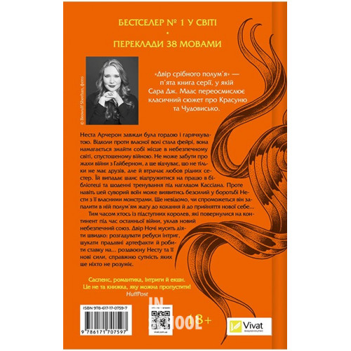 Двір шипів і троянд. Книга 4. Двір срібного полум'я., Сара Джанет Маас 978-617-17-0759-7 Неста Арчерон завжди була гордою й гарячкуватою. Відколи проти власної волі стала фейрі, вона намагається знайти собі місце в небезпечному світі, спустошеному війною. Не може забути про жахи війни з Гайберном, а ще відчуває, що не тільки не має друзів, але й втрачає любов рідних сестер. Їй випадає шанс відпружитися на працю в бібліотеці та щоденні тренування під наглядом Кассіана. Проте навіть цей суворий воїн може виявитись безсилий у боротьбі Нести з її власними монстрами. Ще невідомо, чи спроможеться він запалити в ній полум’ям жагу до кохання й до прийняття нової себе… Тим часом хтось із підступних королев, які повернулися на континент під час останньої війни, уклав новий небезпечний союз. Двір Ночі мусить діяти швидко: розгадувати ребуси інтриг, шукати прадавні артефакти й робити ставку на... роздвоєну Несту та її нові сили, справжню сутність яких ще ніхто не розуміє.