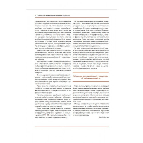 Еволюція українського вбрання. Сторінки історії., Зінаїда Васіна 978-966-982-137-9 Історія українського вбрання налічує не одне тисячоліття. Ще за сивої давнини наш народ створював самобутні зразки одягу, взуття й аксесуарів, що втілилися в подальших варіантах традиційного костюма. У різні часи на різних теренах українське вбрання розвивалося по-своєму, збагачувалося оригінальними рисами, притаманними населенню тієї чи іншої місцевості, всотувало досвід і естетику різномантних культур. Історія вбрання невіддільна від історії народу, від його психологічних, естетичних, духовних прагнень, невичерпного творчого потенціалу.Тільки через історію вбрання можна отримати цілісне уявлення про історію народу, держави, світу.У роботі використано матеріали з музеїв, фондів, бібліотек України, Канади, Інституту археології НАН України, з приватних колекцій ПЛАТАР, Стелли Бєньямінової, роботи Народного майстра Валентини Ануарової-Лісоколенко, а також колекції реконструкцій у матеріалі історичного костюма КДАДМПД ім. М. Бойчука.