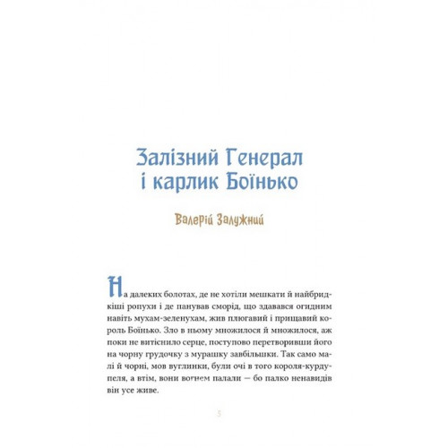 Героїчні казки., Ірина Мацко 978-617-17-0220-2 Серед квітучих садів і золотих ланів розкинулася казкова держава, де жив вільний і гордий народ. А в сусідній країні під владою жорстокого й боягузливого короля-курдупля Боїнька животіли люди сірі й залякані. Якось охопила того коротуна люта заздрість: вирішив він поневолити щасливий співучий народ і пішов на нього війною. Та постали проти нього сміливці… Пташка зі сталі, яка запалювала серця посеред темряви й болю. Відчайдушна Тайра, яка повертала воїнів до життя. Михайло у розлюченій вишиванці, міцнішій за будь-яку броню. Залізний Генерал повів у бій тисячі хоробрих воїнів. І перемогли вони й Боїнька, і Покору, і Дику Потвору, і Зло, і всю нечисть, яку війна принесла із собою. І до віку стоятимуть герої та героїні на сторожі миру та спокою: хтось на землі, а хтось на небі. І слава про них ширитиметься світом.