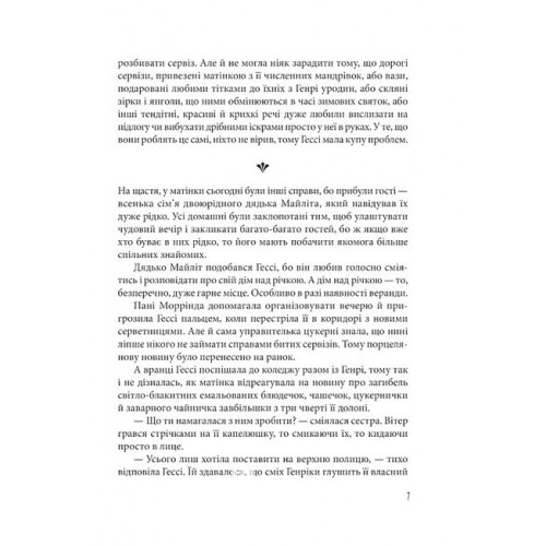 Гессі., Наталія Матолінець 978-966-942-290-3 У затишному світі, що нагадує часи Belle Epoque, де люди дбають передусім про мистецькі насолоди, танцювальні вечірки й вишукані манери, живе 15-річна Гестія Амалія. Проте її життя незбагненним чином перетинається з іншим світом — невидимим, але вловлюваним у химерних подіях і яскравих снах. І чим далі, то більше Гессі розуміє: вона має розгадати хитросплетіння цих світів — лише тоді сповна пізнає себе… Дівчина балансує між очікуваннями інших і тим, до чого озивається її серце, але рано чи пізно доведеться обирати. Це історія довгих пошуків і неминучих потрясінь. Історія давніх богів, долі яких вплелися в життя людей. І про те, що закохатися до нестями можна, просто побачивши очі, які до тебе всміхаються. Розповідь про звичайну дівчинку та її незвичайну внутрішню магію.