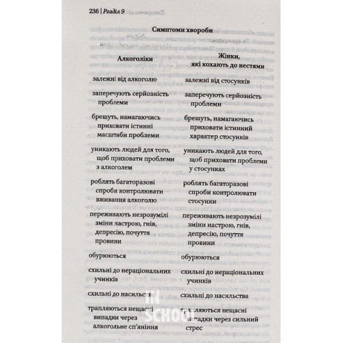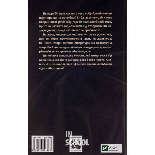 Жінки які кохають до нестями., Робін Норвуд 978-617-690-694-0 Цей посібник із самодопомоги написаний для жінок, які роблять свого романтичного партнера і його потреби центром життя, не дбаючи насамперед про себе. Норвуд зазначає, що їм найбільше комфортно, коли вони жертвують собою, щоб допомогти своїй коханій людині. Такі жінки застрягли в глибоко вкоріненій звичці відкладати власні потреби, якими б значними вони не були. Авторка зазначає, що проблема часто йде з дитинства, де батько не проявляв любові й турботи про дівчинку. Вже в дорослому віці вона несвідомо прагне стосунків з емоційно недоступними чоловіками та стає одержимою тим, щоб завоювати їхнє недосяжне кохання, тим самим доводячи собі, що гідна прихильності, якої не отримувала від тата. У цій книзі авторка допомагає читачкам розпізнати проблему, усвідомити необхідність боротьби й почати шлях до зцілення.