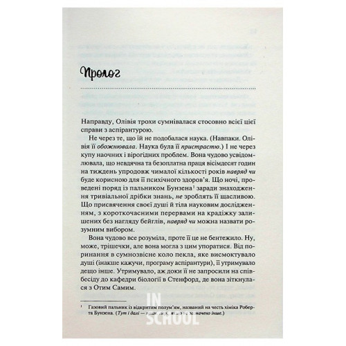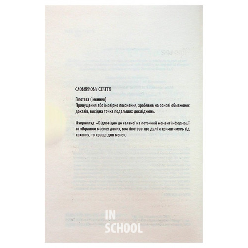 Гіпотеза кохання., Алі Гейзелвуд 978-617-170-010-9 Олівія Сміт — біологиня, яка мріє не про романтичні стосунки, а про докторський ступінь. Але що робити, коли найліпша подруга не дає тобі спокою з отим коханням ні вдень, ні вночі? Звісно ж, знайти хлопця, який вдаватиме любчика. На цю роль годиться не абихто, а молодий і гарячий професор Карлсен: м-м-м, біологія, Стендфорд, поцілунки... Непоганий початок, погодьтеся! Олівія має чіткий план і не чекає від славного на всю кафедру Адама «Гедзя» Карлсена розуміння чи підтримки. Але після інциденту на великій науковій конференції Адам стає на її бік. І раптом дівчина помічає, що ї ї обранець не лише розумний, але й чуйний і врівноважений хлопець… із кубиками пресу (о боги!). Щойно маленький експеримент виходить з-під контролю, а теорія романтики розбивається на друзки, як Олівія розуміє: дослідження власного серця під мікроскопом буде складнішим за гіпотезу кохання!"Невловимий одноріг серед сучасних любовних романів — укладений на небесах тандем глибокої прози й ескапістського щастя."