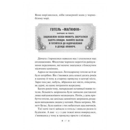 Готель "Маґніфік"., Емілі Дж. Тейлор 978-617-17-0561-6 Книга «Готель Маґніфік» — це підлітковий фентезі-роман американської авторки Емілі Дж. Тейлор, що підкорить серце поціновувачів історій «Каравал» і «Нічний цирк». Сестри Джані та Зоса ледве зводять кінці з кінцями у портовому містечку Дюрк. Старша Джані робить усе можливе, щоб турбуватись про молодшу після смерті матері, а втім, цього вистачає лише на виживання.Похмурі будні яскравим спалахом змінює появ оповитого магією готелю «Маґніфік». Там — видовищні розваги, можливість блискавично швидких подорожей та працевлаштування, адже містичний заклад шукає нових робітників. «Маґніфік» з’являється лише на одну ніч раз у десятиліття, й Джані переконана: пропустити шанс змінити життя й вибратися із бідності було б великою помилкою.Дівчата вихопили щасливий білет, підписали магічні контракти й опинилися в готелі. Море розкоші, пригод і магії захоплює сестер з головою. Розглядаючи «Маґніфік» вже більш тверезим поглядом, Джані починає помічати зловісність усього, що відбувається в готелі. Яка ж таємниця прихована за його чарівливим фасадом?