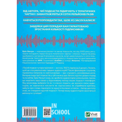 Гучніше! Як створювати круті подкасти., Ерік Нюзум 978-966-982-693-0 Від автора, чиї подкасти лідирують у тематичних чартах і завантажуються сотні мільйонів разів.Навчіться розповідати так, щоб усі заслухалися!Завдяки цим порадам вам гарантовано зростання кількості підписників!«Такий подкаст учора трапився — вогонь. 100 % підписка й донат». Хочете, щоб це стосувалося вас і ваших аудіоісторій? Тисячі фоловерів-слухачів, підтримка патронів та найголовніше — тебе слухають, роззявивши рота. Ветеран індустрії подкастів у цій книжці дає багато крутих дієвих порад та інсайтів. Ерік Нюзум знає, як зробити аудіоісторію унікальною, такою, що виділить ваш канал у бурхливому потоці інших подкаст-платформ. Яку розповідь вибрати та як її виразно подати, де шукати свою аудиторію, як навчитися мислити як підписники, як сприймати критику, забути про слова-паразити та нудні клішовані штампи… Автор достоту знає, як створити крутий подкаст. Тепер вашу аудіоісторію достоту захочеться ввімкнути гучніше!