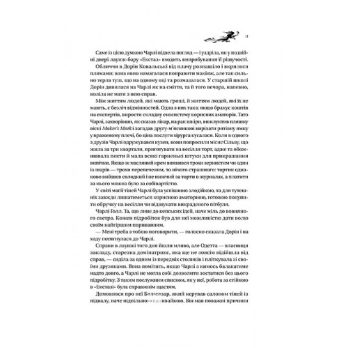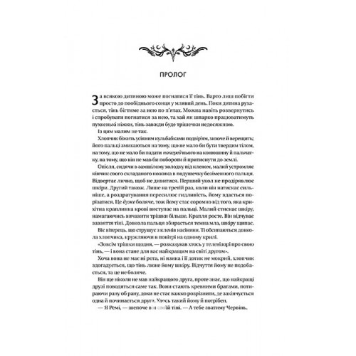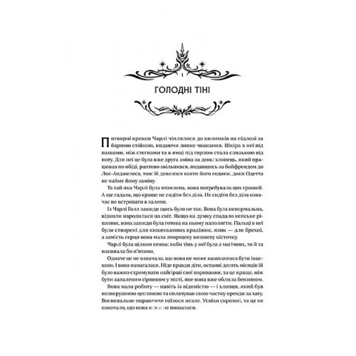 Книга ночі (з кольоровим зрізом)., Голлі Блек 978-617-17-0635-4 У світі магії тіней Чарлі Голл — відома злодійка. Десять років вона працювала на сутінників — владних над тінями людей. Чарлі цупила для них старі книжки та сувої, що містять способи маніпуляцій із тінями, всілякі магічні секрети, а часом і дещо гірше… Але вона змінилася. Працює барменкою. Живе з хлопцем без тіні та одержимою прагненням магії сестрою. Раз у раз відкидає пропозиції власника салону тіней, який хоче вмовити її знову працювати на нього… Минуле, від якого Чарлі намагається втекти, переслідує її, мов та ж таки тінь. Тож коли мільярдер-садист Лайонел Солт примушує її відшукати викрадену «Книгу ночі», яка багато для кого є ласою здобиччю, дівчина поринає в знайомий світ хаосу, брехні, крові та маніпуляцій.