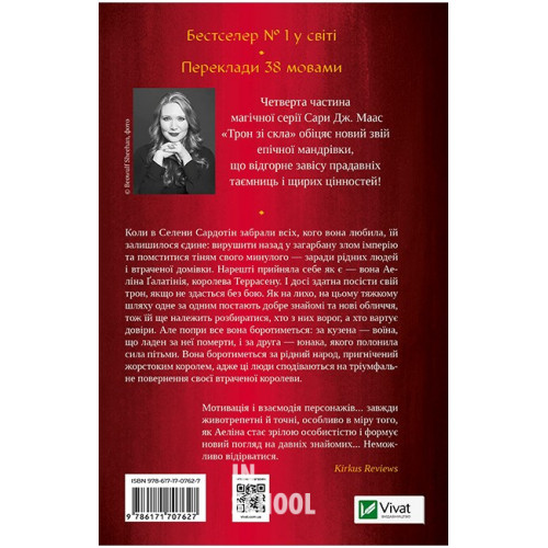 Королева тіней., Сара Джанет Маас 978-617-17-0762-7 Коли в Селени Сардотін забрали всіх, кого вона любила, їй залишилося єдине: вирушити назад у загарбану злом імперію та помститися тіням свого минулого — заради рідних людей і втраченої домівки. Нарешті прийняла себе як є — вона Аеліна Ґалатінія, королева Террасену. І досі здатна посісти свій трон, якщо не здасться без бою. Як на лихо, на цьому тяжкому шляху одне за одним постають добре знайомі та нові обличчя, тож їй ще належить розбиратися, хто з них ворог, а хто вартує довіри. Але попри все вона боротиметься: за кузена — воїна, що ладен за неї померти, і за друга — юнака, якого полонила сила пітьми. Вона боротиметься за рідний народ, пригнічений жорстоким королем, адже ці люди сподіваються на тріумфальне повернення своєї втраченої королеви.