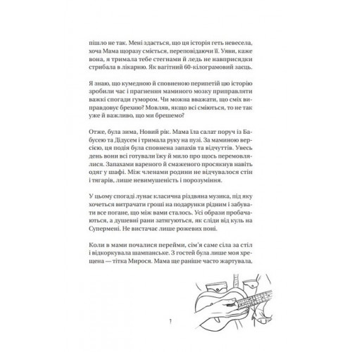 Космос, прийом., Марк Лівін 978-966-982-763-0 Зоряна складає сумні пісні на укулеле й зачитується книжкою про хлопця, який мандрує лісами. А інколи боляче б’ється ногою об кут, щоб вивільнити свої емоції й почуття. Зоря — м’яка, потайлива і трохи незграбна підлітка. Ніхто не знає, що вона відчуває насправді. Навіть Мама. Ровесники закохуються, курять травку, завойовують авторитет, а Зоря витрачає всі заощадження на пошук батька, про якого багато років поспіль затято мовчить уся родина. Дівчина вирушає на пошуки чоловіка, причетного до її появи на світ, — і опиняється на порозі дому батька, який вважає себе ветераном міжгалактичної війни…Це зворушлива історія про дорослішання, людські байдужість і небайдужість, дружбу, ментальне здоров’я та маленькі кроки назустріч людям, яких любиш.