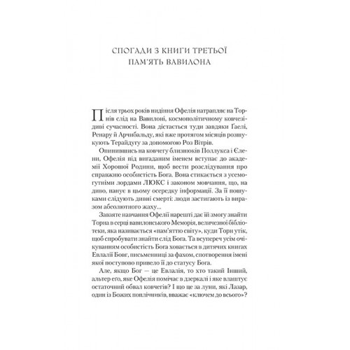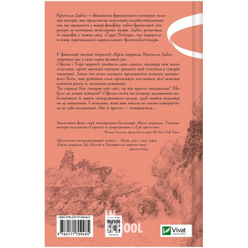 Крізь дзеркала. Книга 4. Буря лун., Крістелль Дабос 978-617-17-0948-5 У фінальній частині тетралогії «Крізь дзеркала» Крістелль Дабос запрошує нас у саме серце великої гри. Офелія і Торн нарешті знайшли одне одного, недовіра між ними подолана, проте закохані змушені тримати свої стосунки в суворій таємниці. Лише так вони зможуть продовжити пошуки загадкового Бога, чия руйнівна сила продовжує поглинати цілі шматки ковчегів разом із тисячами невинних. Чи справді Бог створив цей світ, чи він просто ошуканець? Що було до появи ковчегів? Офелія стоїть на початку надзвичано небезпечного й навіть саморуйнівного шляху, щоб знайти відповіді на ці запитання. І можливо, вона вже ніколи не зможе повернутися до себе колишньої. Або й просто — повернутися…