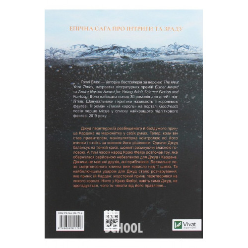 Лихий король., Голлі Блек 978-966-982-170-6 Джуд перетворила розбещеного й байдужого принца Кардана на маріонетку у своїх руках. Тепер, коли він став правителем, маніпуляторка контролює всі його вчинки і стоїть за кожним його рішенням. Одначе Джуд балансує на тонкій кризі, щомиті ризикуючи власною головою. А тим часом народ Краю Фейрі розпочав гру, яка обернулася серйозною небезпекою для Джуд і Кардана. Дівчина не має ані друзів, ані прибічників. Безжальне лезо смертоносного клинка вже нависло над її шиєю. Та найболючішим ударом для Джуд стало розчарування, яке приніс їй Кардан: жорстокий принц перетворився на лихого короля. Ніхто у Краю Фейрі, навіть сама Джуд, не здогадується, чого їм чекати від його правління...