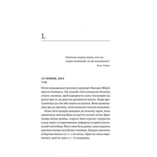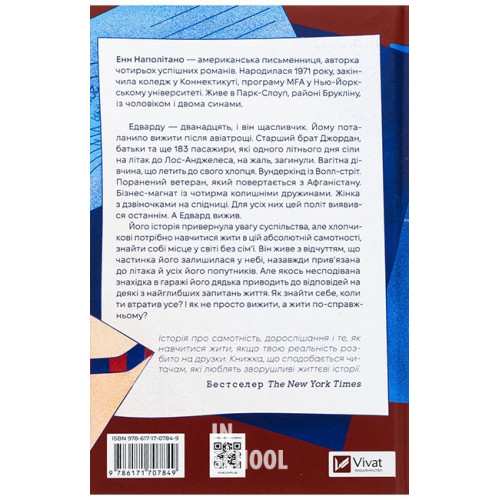 Любий Едварде., Енн Наполітано 978-617-17-0784-9 Едварду — дванадцять, і він щасливчик. Йому поталанило вижити після авіатрощі. Старший брат Джордан, батьки та ще 183 пасажири, які одного літнього дня сіли на літак до Лос-Анджелеса, на жаль, загинули. Вагітна дівчина, що летить до свого хлопця. Вундеркінд із Волл-стріт. Поранений ветеран, який повертається з Афганістану. Бізнес-магнат із чотирма колишніми дружинами. Жінка з дзвіночками на спідниці. Для усіх них цей політ виявився останнім. А Едвард вижив.Його історія привернула увагу суспільства, але хлопчикові потрібно навчитися жити в цій абсолютній самотності, знайти собі місце у світі без сім’ї. Він живе з відчуттям, що частинка його залишилася у небі, назавжди прив’язана до літака й усіх його попутників. Але якось несподівана знахідка в гаражі його дядька приводить до відповідей на деякі з найглибших запитань життя. Як знайти себе, коли ти втратив усе? І як не просто вижити, а жити по-справжньому?