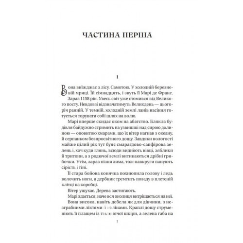 Матінка., Лорен Ґрофф 978-617-17-0036-9 Марі де Франс було лише сімнадцять, коли її вигнали з королівського двору. Дебелій байстрючці годилося бути не придворною леді, а пріоресою в бідному англійському абатстві. Так волелюбна Марі опинилася у світі, де панують послух, обов’язок та молитва. «Матінка» — це захоплива історія про амбітну та чуттєву пріоресу, геніальну стратегиню, дипломатку, поетку, захисницю жінок, у душі якої проросла віра. Насамперед — віра в себе.