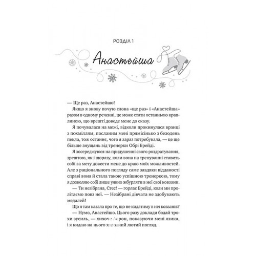 Мейпл-Гіллз. Книга 1. І зійде крига., Ханна Ґрейс 978-617-17-0731-3 Анастейша Аллен — наполеглива вимоглива фігуристка. Усе життя вона працює над тим, щоб потрапити до збірної США, і, здається, все йде за планом. Талановита спортсменка здобуває повну стипендію Каліфорнійського університету в Мейпл-Гіллз і місце в команді.Нейтан Гокінс — хокеїст, душа товариства, справжній капітан, ладний пожертвувати собою заради команди. Навіть тоді, коли доведеться ділити ковзанку з фігуристами. Навіть тоді, коли доведеться підставити плече уїдливій Анастейші, яка, здається, ненавидить його.Чи зможуть вони знайти спільну мову та пройти шлях від суперників до справжньої пари в усіх сенсах цього слова?Книга «І зійде крига» — це New Adult роман від британської письменниці Ханни Ґрейс. Фігуристка Анастейша Аллен планує стати олімпійською чемпіонкою: вона здобула стипендію в Університеті Каліфорнії, і наполегливо тренується з Аароном Карлайлом, якого вважають генієм. Через виснажливі відпрацювання елементів на льоду, Аллен відчуває емоційну напругу й стрес, й тому відвідує терапевта.Нейтан Гокінс — капітан хокейної команди, що прагне потрапити до НХЛ. Одного дня хлопець побачив, що їхня ковзанка зруйнована. Адміністрація університету вирішила: певний час фігуристи й хокеїсти будуть займатися на одному майданчику. Нейтан зрозумів, що ситуація критична й іншого виходу немає, але Анастейша була обурена. У неї регіональні змагання за п’ять тижнів, як їм ділити ковзанку?!