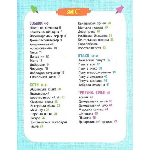 Мініенциклопедія. Хатні улюбленці 978-966-982-724-1 Дитяча мініенциклопедія про хатніх улюбленців — незамінний помічник у виборі вірного друга та справжнього члена родини. Юні читачі дізнаються чимало фактів про спосіб життя, характер й особливості догляду за собаками, котами, птахами та гризунами. Завдяки яскравим фотографіям можна довідатися більше про особливості будови дивовижних хатніх улюбленців.